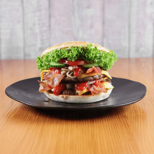 mit 230g Rindfleisch-Patty, viel Bacon und hausgemachter Bacon-Mayonnaise, ohne Tomaten und Gurken